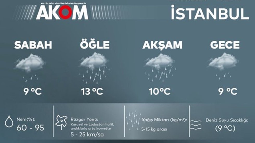 AKOM'dan yapılan açıklamada, "İstanbul’da sıcaklıkların hafta boyunca 12–16 °C aralığında seyretmesi beklenirken, yağışlı havanın bütün hafta etkili olacağı tahmin edilmektedir" denildi.