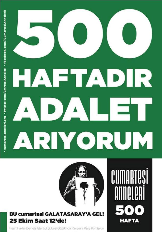 Cumartesi Annelerinin 500. Hafta toplantısı için Sanatçı, yazar, aydınların İHD İstanbul şubesinde basına ve kamuoyuna yaptığı çağrı yaptı.